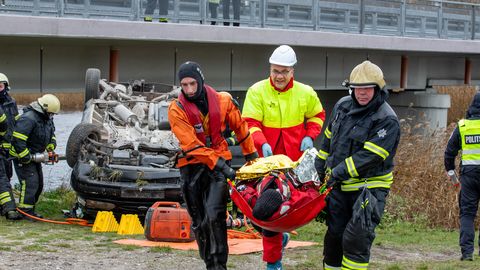 Сегодня на мосту Валгеранна прошли учения. Согласно сценарию, на мосту завалился на бок синий легковой автомобиль, из него доносятся крики о помощи. Еще одна машина перелетела через ограду моста на берег и перевернулась на крышу, из нее слышатся стоны. rus.postimees.ee »