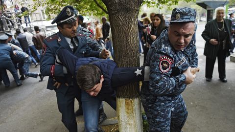 В центре Еревана полиция начала задерживать и доставлять в полицейские участки граждан, участвующих в антиправительственных протестах. Уже задержаны более 60 человек, преимущественно молодых людей, эта цифра растет, сообщает в субботу, 21 апреля, корреспондент DW.
