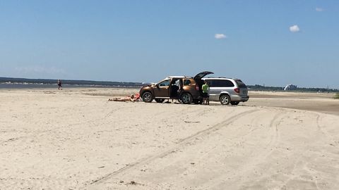 Летняя погода и морская вода как магнит притягивает отдыхающих. Некоторые решили, несмотря на запрет, проехаться по пляжу прямо на машине и припарковаться поближе к воде.